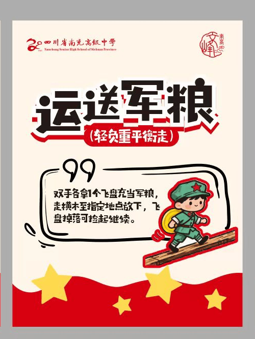 ● “运送军粮”(轻负重平衡走):学生手持“军粮”,走横木至指定“军粮点”放下,“军粮”掉落便捡起继续,锻炼了平衡与耐力。