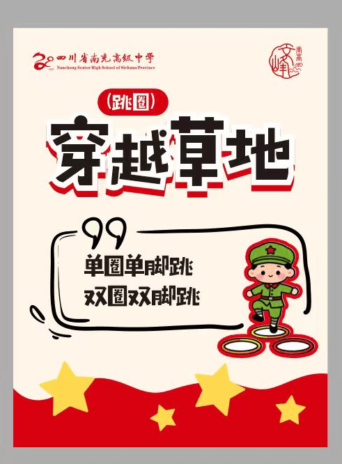 ● “胜利会师”(绕杆跑):从“军粮点”S型绕杆跑至终点,组员共同拿起国旗,完成打卡。